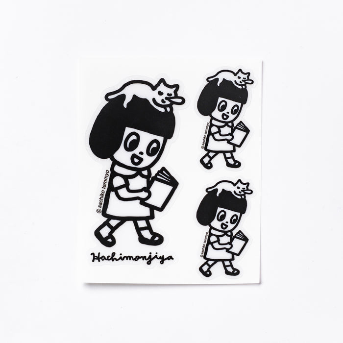 イラストレーターの天明幸子さんに、「八文字屋で、楽しそうに本を読む女の子」を描き下ろしていただいたステッカーです。